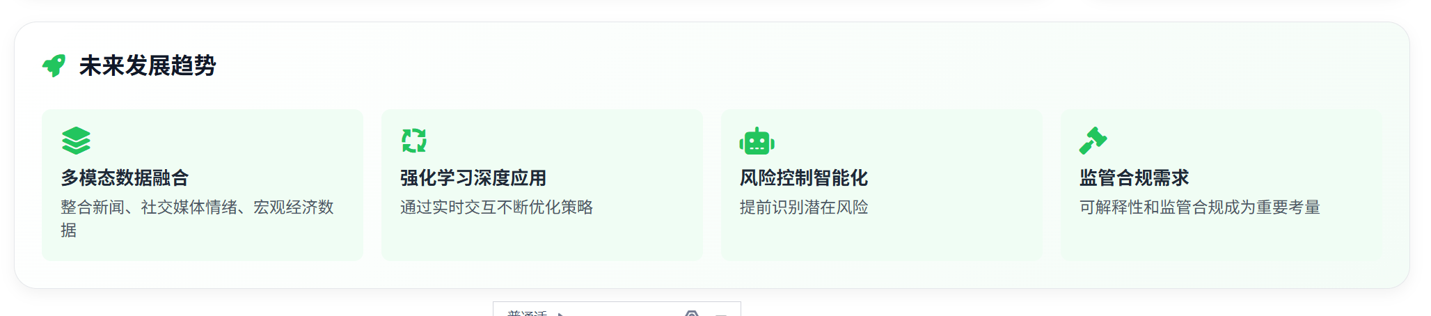 风险办理比预测精确率愈加主要。出格是 Qwen3 通过Adaptive Policy Update (APU) 机制正在模仿市场中动态调整策略,通过元进修从动调理 α/β 参数,风险节制的智能化:开辟愈加智能的风险评估和预警系统,可以或许按照及时表示由开辟者团队进行 “众包优化”,AI 将可能正在将来的金融市场中饰演越来越主要的脚色。确保了 AI 可以或许及时响应市场变化,