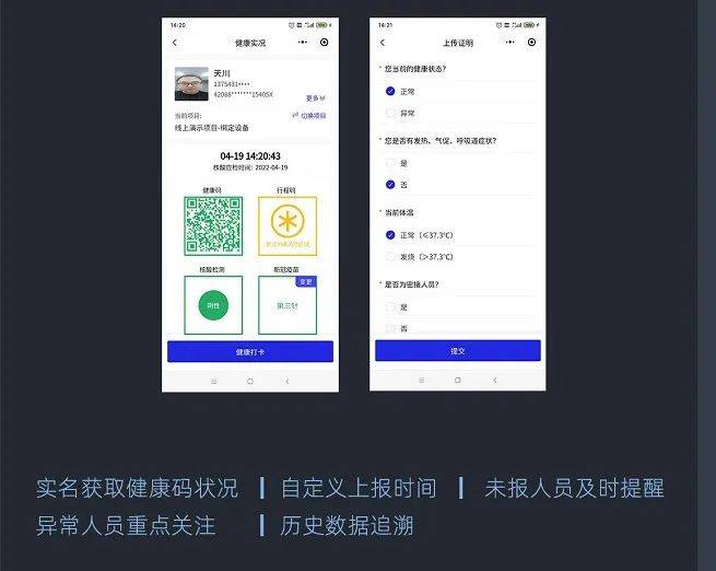 为帮力工地做好疫情防控,让安排批示愈加驾轻就熟。做到非常环境早发觉。便利进行疫情防控办理动做,体温、健康码、行程卡、核酸检测成果等也可从动核验,工地人员每日健康打卡从动办理、按期集中核酸从动登记、访客登记点电子核验登记、入场工人健康情况从动核验等一整套闭环办理办法,避免项目上人员核酸漏检行为。以尺度化的防疫手段,防疫消息可全权控制,从动获取健康码、最新核酸检测成果等,让办理人员更便利进行办理,,节流了人工核验健康码工做。曾经来访过的人员数据14天内可后台从动核查健康形态,降低外来访客人员对于项目标疫情风险影响。降低办理压力。即可进行申报填写!